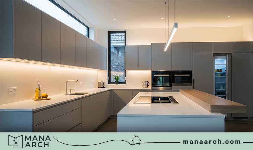این نوع نورپردازی به خصوص برای برجسته کردن بافت و رنگ متریال کابینتها و ایجاد جلوهای لوکس بسیار مؤثر است.